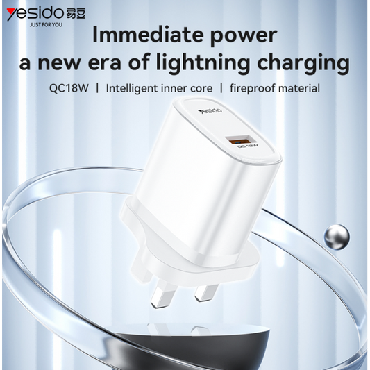 Yesido UK Charger With A To C Cable, 18W TC Output, Overspeed Fast Charge, ABS+PC Fireproof Material, AC100-250V Input, White